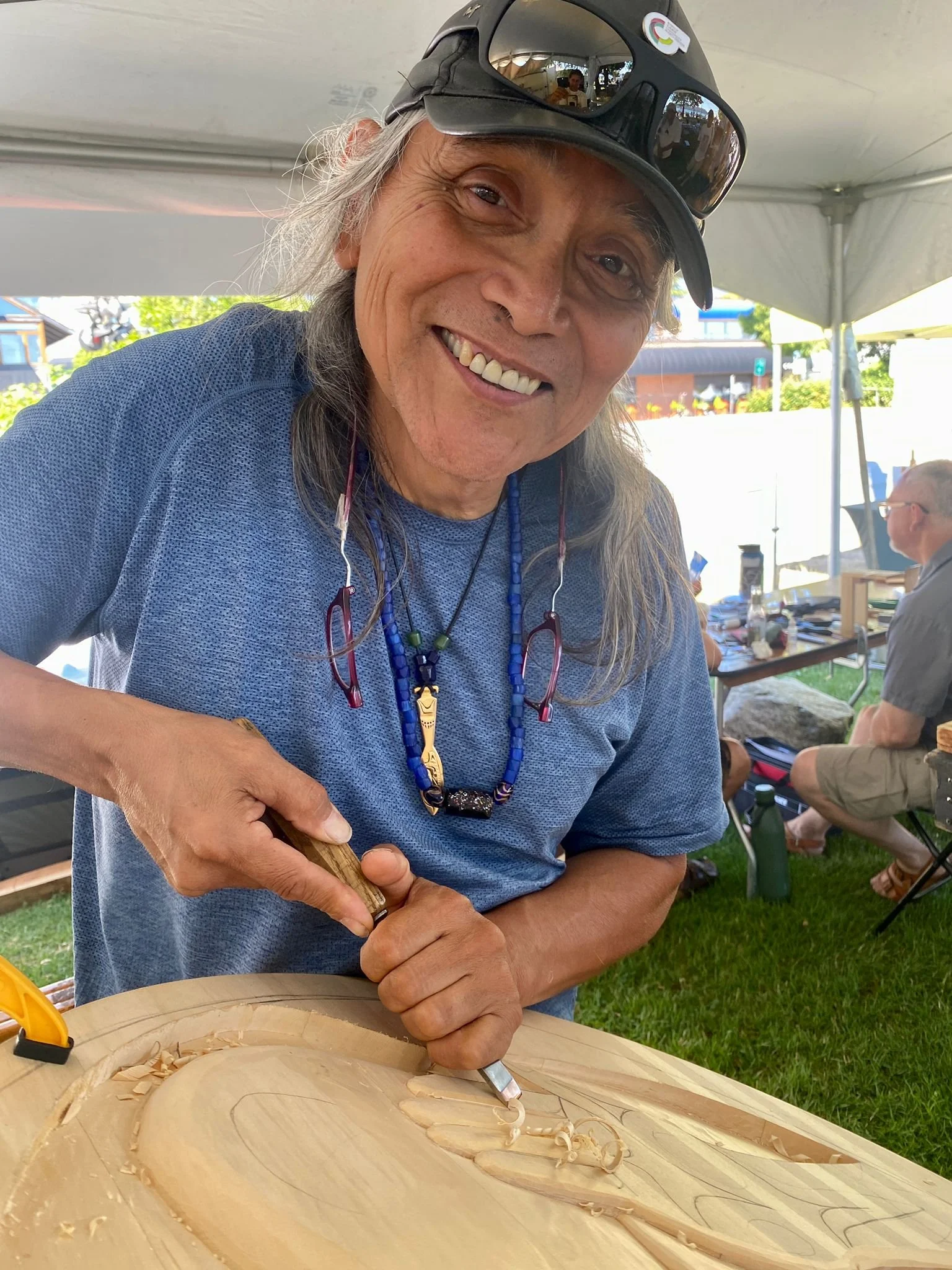 Xwalacktun was born and raised in Squamish. He carries with him the rich ancestries of his father (Squamish Nation) and mother (Kwakwakw'wakw Nation) of the Coast Salish clans. His father, Pekultn, carried a hereditary chieftainship from Seymour Creek in North Vancouver. He would like to acknowledge Capilano College and Emily Carr College of Art for teaching him the skills to have a start in his career. His endurance and commitment through trial and error helped propel him forward as an artist. He is currently working on double doors for West Vancouver School District, plus working on a 16-foot metal piece for the Audain Art Museum in Whistler and a stone sculpture for the Spirit Trail.